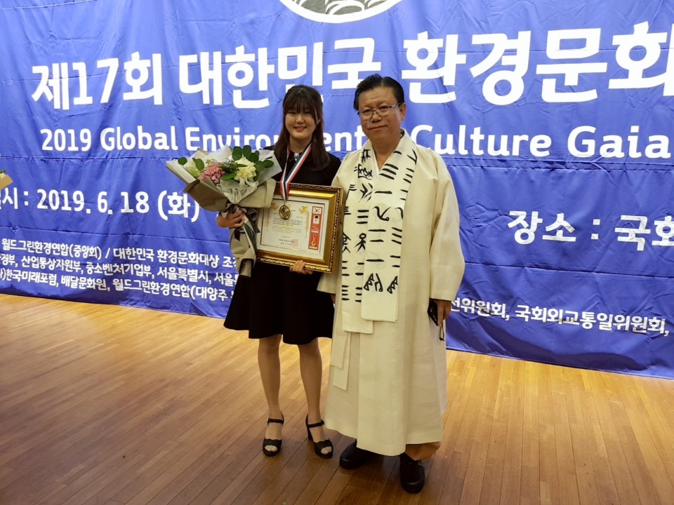 '국회외교통일위원회위원장상' 수상자 박지윤 학생과 월드그린환경연합 박광영 총재가 기념촬영을 하고 있다.