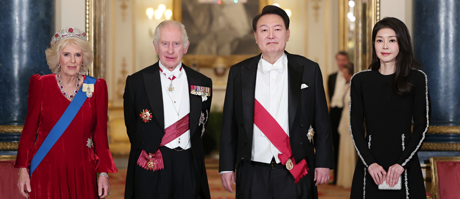 영국을 국빈 방문 중인 윤석열 대통령과 부인 김건희 여사가 21일(현지시간) 런던 버킹엄궁에서 열린 국빈 만찬에 찰스 3세 영국 국왕, 커밀라 왕비와 함께 기념촬영을 하고 있다.(사진=대통령실)