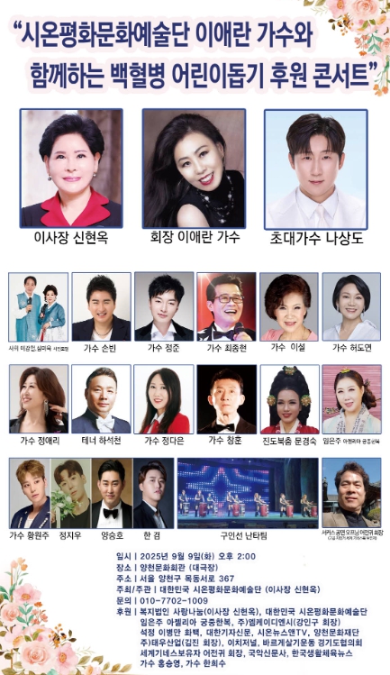 <내외매일신문=문경숙 기자> 시온평화문화예술단 이사장 신현옥 목사는 2025년 9월 9일 오후 2시에 서울 양천문화회관 대극장에서 백혈병 어린이 돕기 후원 콘서트 개최한다.