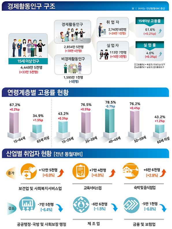 연령별로는 60세이상에서 37만 2000명, 50대에서 12만 7000명, 20대에서 1만 4000명 각각 증가했으나 40대에서 18만 2000명, 30대에서 3만 2000명 감소했다.