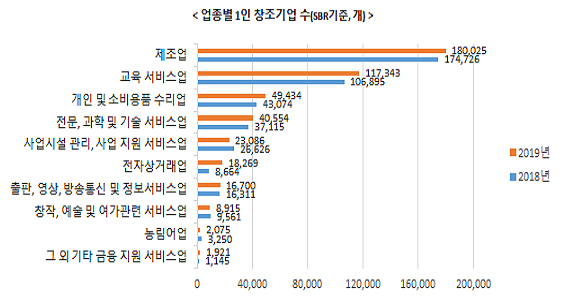 실태조사 결과에 따르면 1인 창조기업은 2017년 40만 2000곳, 2018년 42만 7000곳에 이어 3년 연속 증가했다.