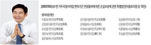 이에 이용호 의원은 “가두리양식어업 면허는 상수원보호를 위해 국가가 공익상 필요에 의해 그 연장을 불허한 것으로, 국가를 믿고 가두리양식어업을 시작한 어민들 입장에서는 억울하고 재산적 손실마저 떠안게 됐던 것”이라면서,