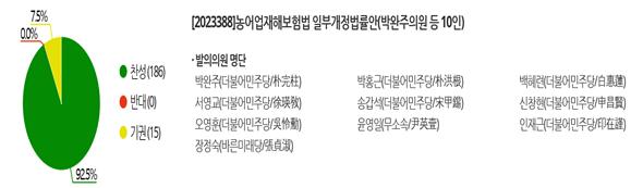<정치부=정완태 기자> 국회 농림축산식품해양수산위원회는 양식수산물재해보험사업도 농업재해보험사업과 같이 농업정책보험금융원에 업무를 위탁함으로써 보다 체계적인 관리ㆍ감독을 통한 보험사업의 안전성과 전문성을 강화할 필요가 있어서 2020년 4월 30일 본회의에서 찬성 186인(92.5%)으로 통과되었다.