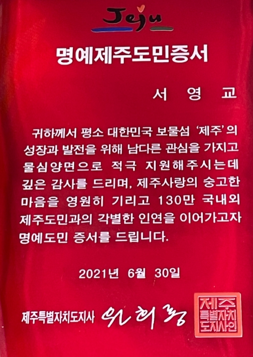 이에 제주도는 특별법 통과를 환영하며 서영교위원장에게 감사의 인사를 전하며 '명예도민증'을 수여했다명예도민증은 제주도의 발전에 대한 기여도공로를 인정하여 도의회 의결로 결정된다.