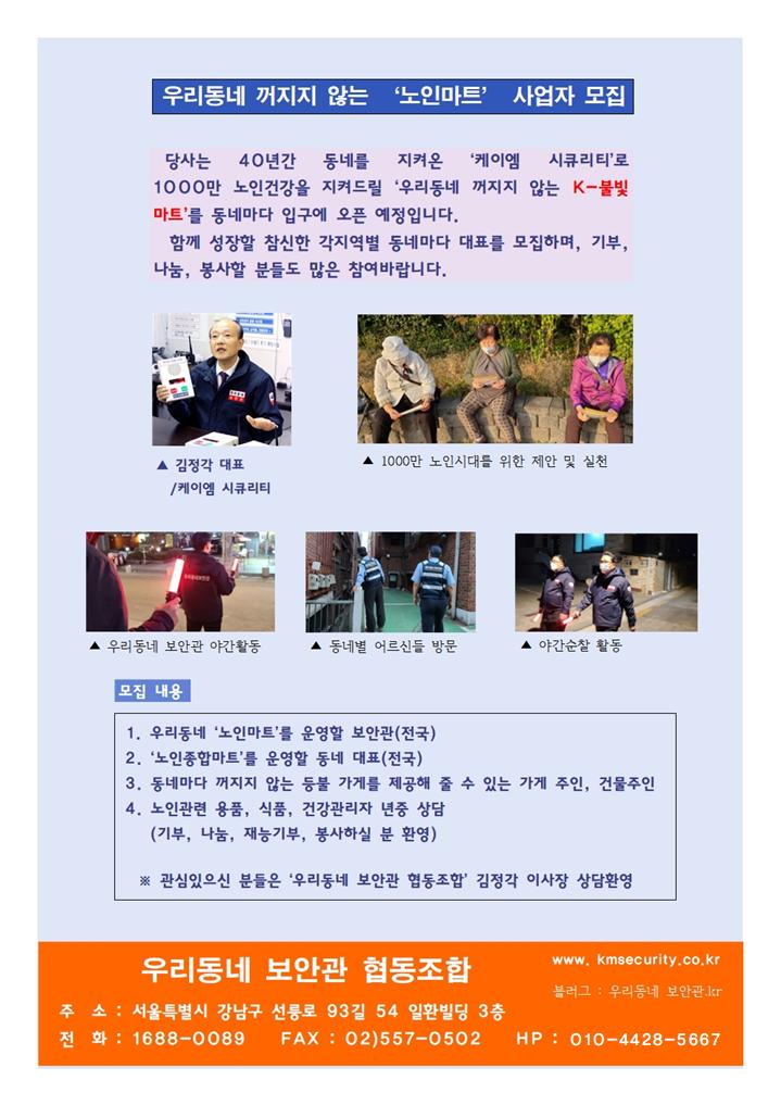 광명통신안전 ‘우리동네 보안관’ 증가하는 독거노인 ‘노인 호출 벨’로 출동 공공분야 영상보안, 관제 노하우 바탕 달려가는 우리동네 보안관 연계 김정각 대표 ‘증가하는 독거노인 돌봄 기여’ #우리동네 보안관 #광명통신안전 #노인 호출 벨 #노인마트 인쇄 주소