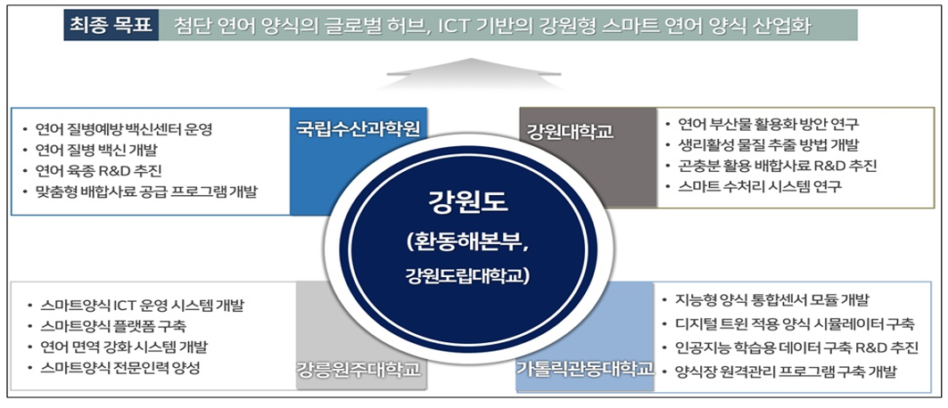 (사진설명) ▶(강원도 환동해본부 )연어 스마트양식 기술개발 ,실증 데이터 수집 및 공유 ,연어 산업화 R&D 총괄 추진 ▶(국립수산과학원 )연어 질병백신 개발 ,연어 육종 개발 ,맞춤형 배합사료 공급 프로 그램 개발 ▶(강원대학교 )연어 부산물 관련 바이오 연구 ․개발 ,신물질 개발 ,사료개발 ▶(강릉원주대학교 )연어 면역 증강제 개발 , ICT …