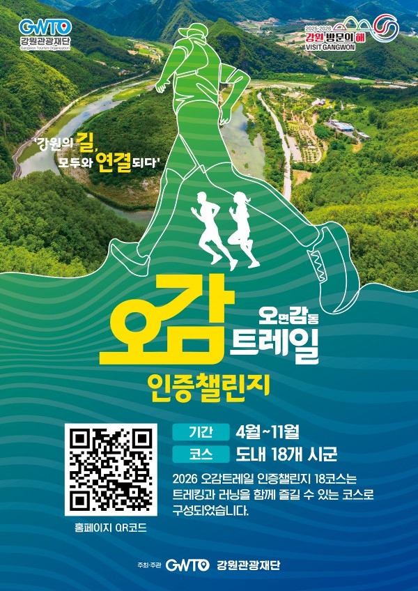 한편 강원관광재단 최성현 대표이사는“2025년 오감트레킹을 통해 걷기 관광에 대한 높은 수요를 확인한 만큼, 2026년에는 러닝과 트레일 요소를 결합한 ‘오감트레일’로 한 단계 도약하고자 한다”며, “보다 역동적이고 참여형 콘텐츠를 통해 강원을 대표하는 체험형 관광지로 발전시키겠다”고 밝혔다.