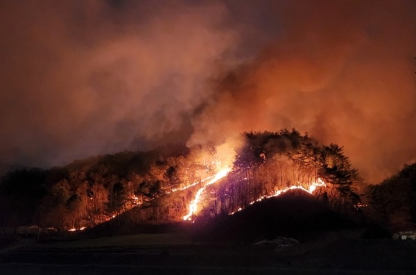 일몰과 함께 헬기는 철수했고, 야간 진화체제로 전환했다. 오후 9시를 기해 산불 3단계로 격상했다. 당국은 우선 지상으로의 확산 저지선을 구축하고, 날이 밝는 대로 가용 헬기를 투입해 진화에 총력을 기울인다는 방침이다.