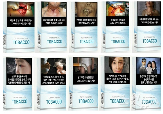 국민건강증진법 개정에 따라 지난해 12월 23일부터 담배공장에서 반출되는 모든 담배제품의 담뱃갑 앞·뒷면(면적의 30% 경고그림, 경고문구 20%)에 경고그림 표기가 의무화됐다.