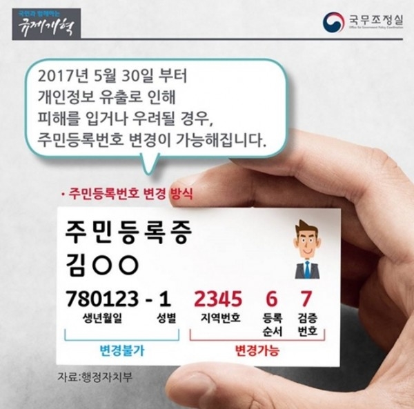 2017년 5월 30일부터 주민등록번호 변경제도가 시행된다. 개인정보유출로 인해 피해를 입거나 우려될 경우, 주민등록번호 변경이 가능해진다.