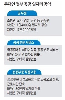 공무원, 경찰관, 군인, 사회복지공무원 등 안전과 치안, 복지를 담당하는 공무원 일자리를 17만4000개, 사회복지·보육·요양·장애인 복지·공공의료 등 사회서비스 공공기관 일자리를 34만개 창출하겠다고 약속했다. 근로시간을 단축하고 공공부문 간접고용업무를 직접고용으로 전환해 추가로 30만개 일자리를 만들겠다고도 공약했다.